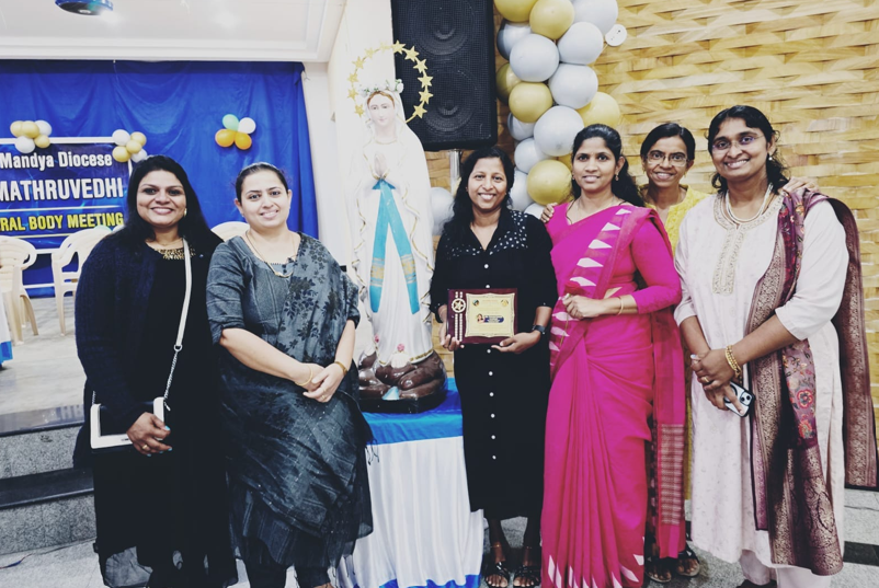 The first General Body Meeting of Mathruvedi, Mandya Diocese, was held at Santhome Church, Hulimavu. Executive members, including Soby and Sonia, actively participated in the gathering. During the meeting, Tessy — the former Forane-level Coordinator from our parish — was honored with a memento in recognition of her dedicated service and leadership in coordinating activities at the Forane level.